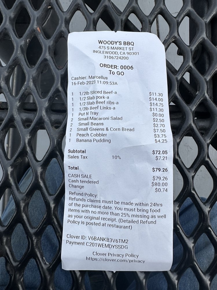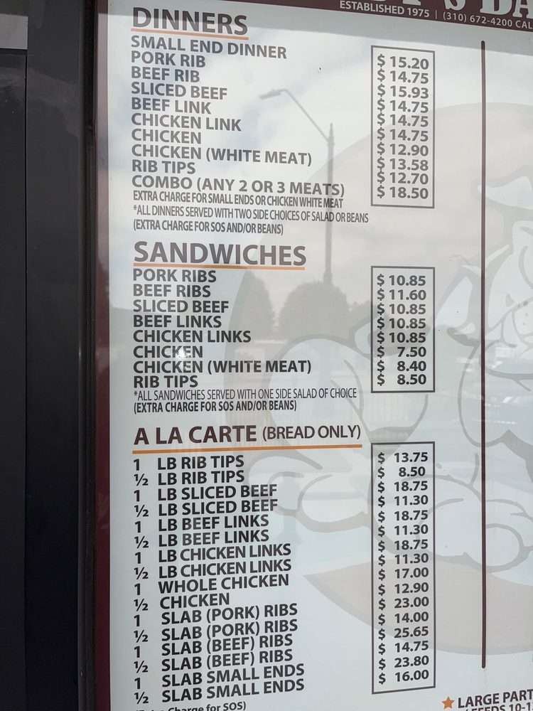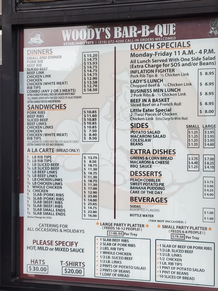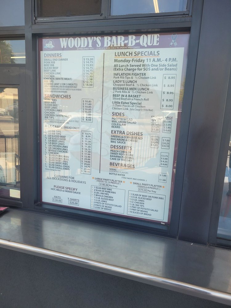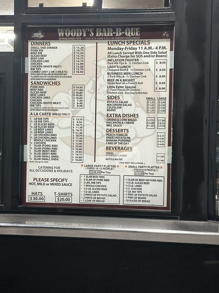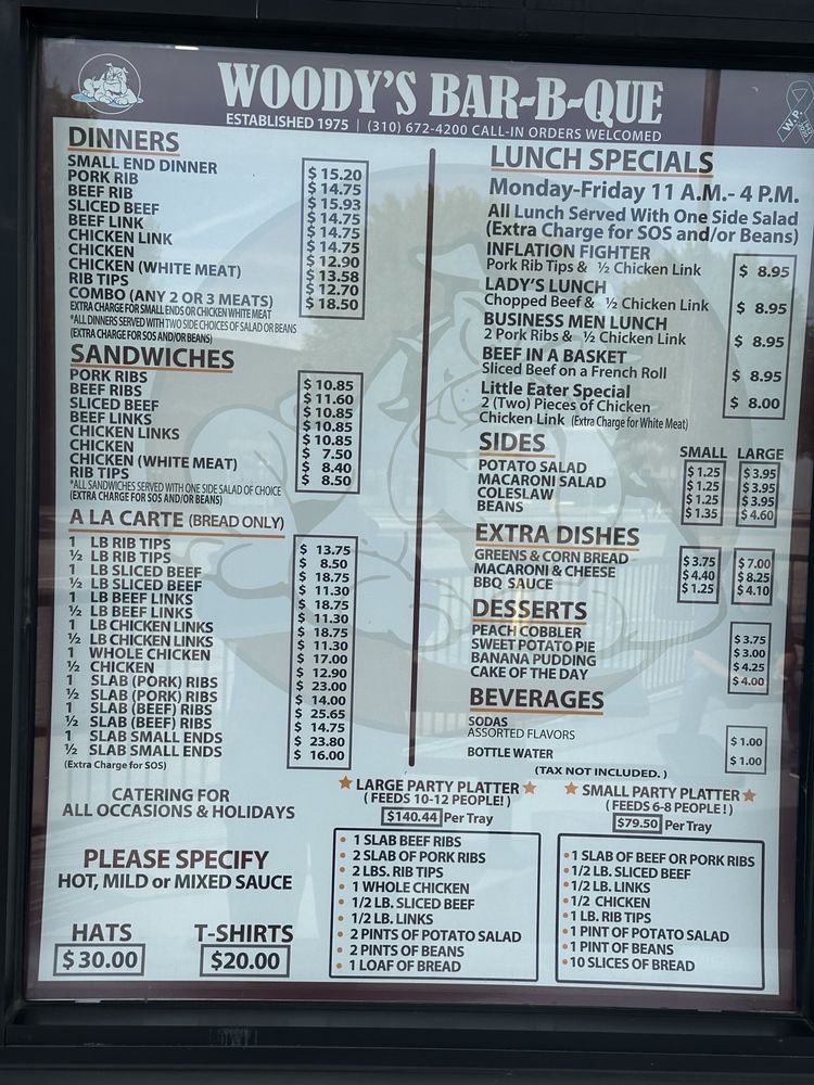 Woody’s Bar-B-Que is a Black-owned BBQ spot located in Inglewood, CA, offering a variety of mouth-watering options for both meat lovers and vegetarians. The menu includes classic BBQ sandwiches like ribs, beef ribs, sliced beef, all beef links, and chicken, each served with a salad and choice of side. Their salads, including potato salad, macaroni salad, and coleslaw, perfectly complement the rich flavors of the meats. With options for delivery, takeout, and catering, Woody's Bar-B-Que is perfect for any occasion. The casual atmosphere, outdoor seating, and happy hour specials make it a great spot to enjoy a delicious meal with friends and family. Don't miss out on the chance to try their tender and flavorful BBQ offerings at Woody’s Bar-B-Que.