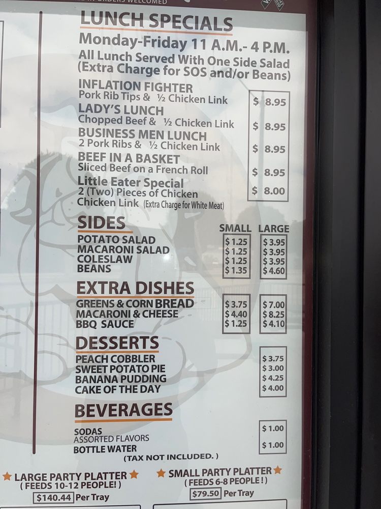 1 slab of beef ribs, 2 slabs of pork ribs, 2 lbs. of rib tips, 1 whole chicken, 1/2 lb. beef, 1/2 lb. links, 2 pints of potato salad, 2 pints of beans, and 1 loaf of bread. Serves 10 to 12 people.